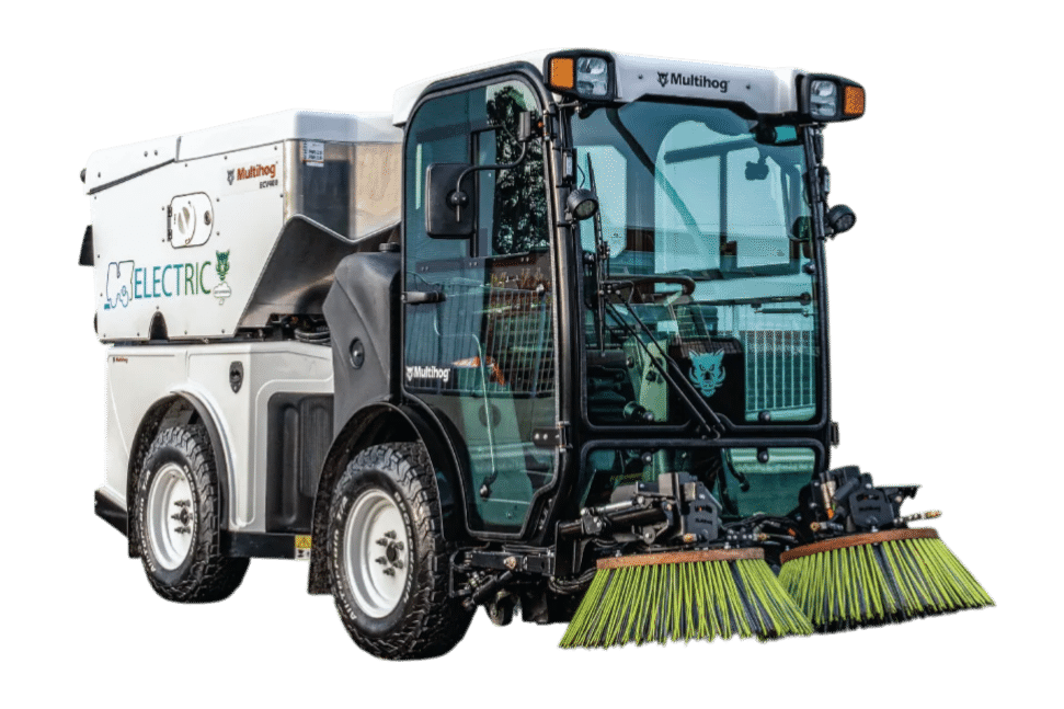 Compact multi-purpose sweeper with a 75 HP Stage V engine. Built-in rear rails for drop spreaders, pressure washer connections, and quick-change attachment system for year-round versatility.